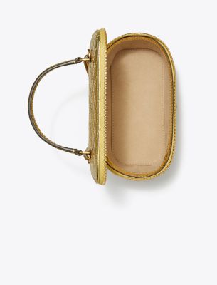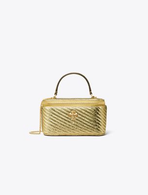 For a season of escape. A mini take on the old-school style, now trending. The Kira Moto Vanity Case is made of metallic leather with quilting inspired by vintage biker jackets, finished with a beveled Double T. Carry it by the top handle or with the removable crossbody strap.