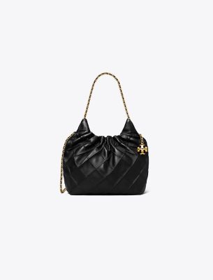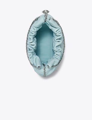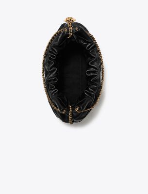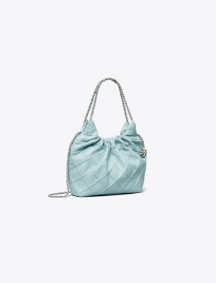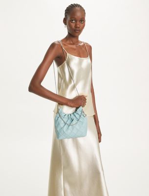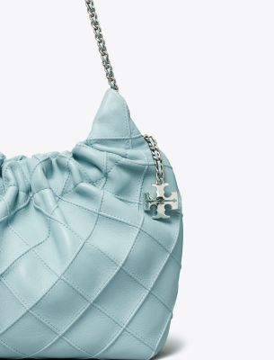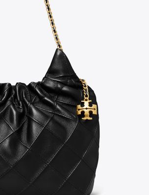 Enduring glamour. Made of soft leather, the Fleming Drawstring Bag is finished with diamond pattern pintucks and a chain strap, laced with leather.