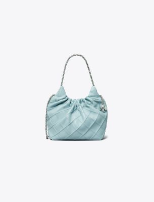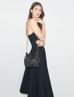 Enduring glamour. Made of soft leather, the Fleming Drawstring Bag is finished with diamond pattern pintucks and a chain strap, laced with leather.